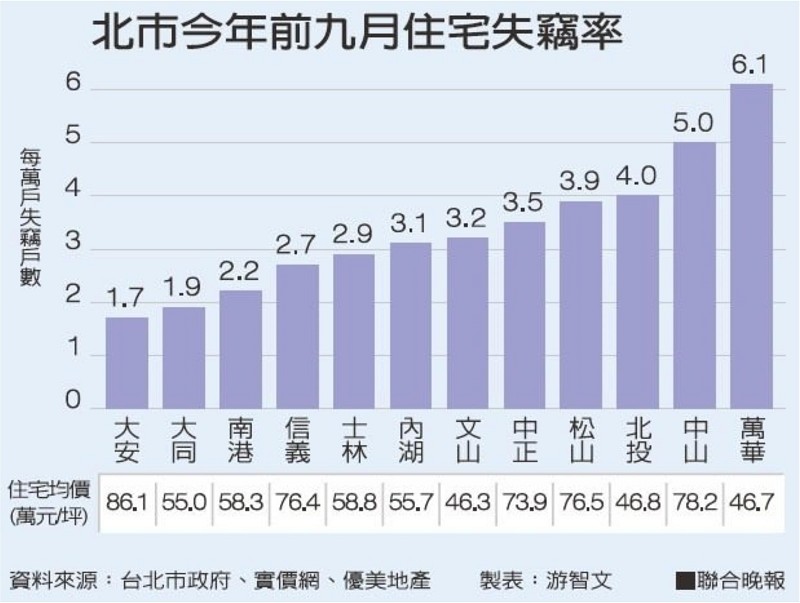| 圖一 : 台北市住宅失竊率(資料來源:台北市政府、實價網、優美地產/聯合晚報) |