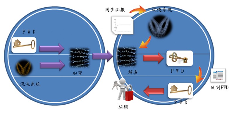 此創新數位化同步之電子鎖設計,主要作品架構分為下圖九左半邊的主系統手機端與右半邊僕系統電子鎖具端,並將數位化離散化後的混沌系統設置於主僕兩端,另將混沌類隨機訊號同步技術設在僕系統端,透過系統加解密與同步的過程方可得到加解密的結果,經過加以比對後系統再判斷是否解鎖成功。