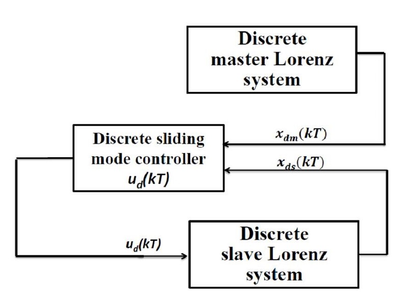 在此作品中,如何將連續之混沌系統離散化,並保有原連續系統之混沌特性,是非常重要的,現利用上述說明的方法,可解決此一問題。而在此電子鎖設計中的同步控制包含主僕2個數位化混沌系統,及同步控制器的設計,現舉例說明,但混沌系統不受限於此說明的形式。在上述說明中得知混沌系統擁有許多不穩定的特性,使用其特性進行加密會擁有非常強大之安全性,但既然其擁有不穩定特性,在進行解密工作時也會遇上許多困難,所以一個強健的同步控制器顯得至關重要,本技術將引用在傳送端及接收端之系統架構如圖四所示: