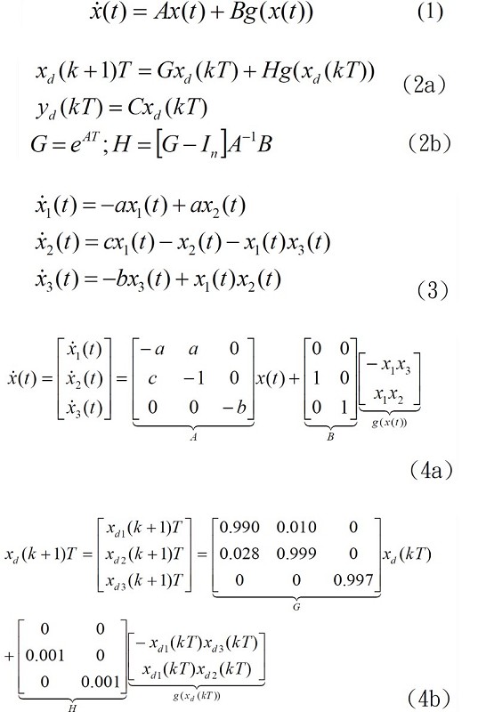 其中包括非線性向量,以及可控的數值。則此型式之混沌系統(1)之離散時間系統可表示如式(2a)與式(2b)。