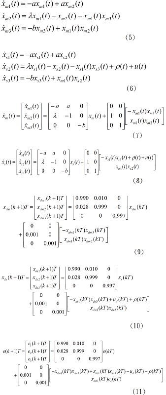 其中為主僕混沌系統狀態,a,b及λ為系統參數,u(t)?R為控制輸入,p(t) ?R為可能的外來擾動。我們將(5)及(6)寫成如式(7-8)的矩陣型式: