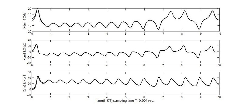 其中模擬的結果如圖五到七所示,由模擬結果可知,主僕混沌系統確實可以達到同步,同時由(16)式可看出,c的選擇可影響誤差收斂速度。