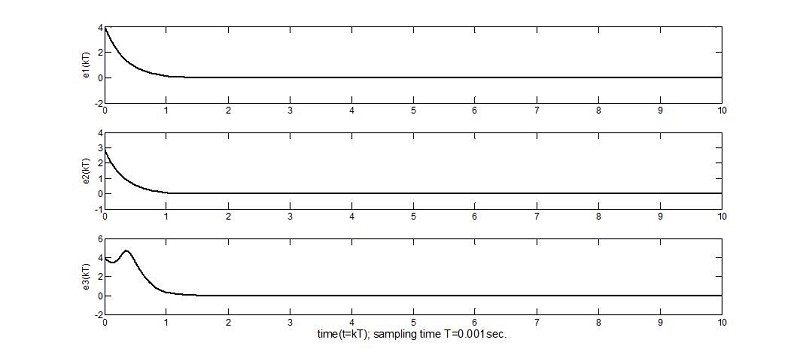 因c滿足│0.99-0.01c│<1,所以e1(kT)收斂到0,同時,e2(kT)也會隨著收斂到0。當e1(kT),e2(kT)均收斂致0,則e3(k+1)T=0.997e3(kT),也就是e3(kT)亦會收斂到0。由上可知,若可設計控制器,使得s(kT)=e2(kT)+ce1(kT)=0恆成立,則主僕混沌系統將可達到同步。以下為抵達條件(reaching condition)。式(15)其中 q>0;為取樣時間。