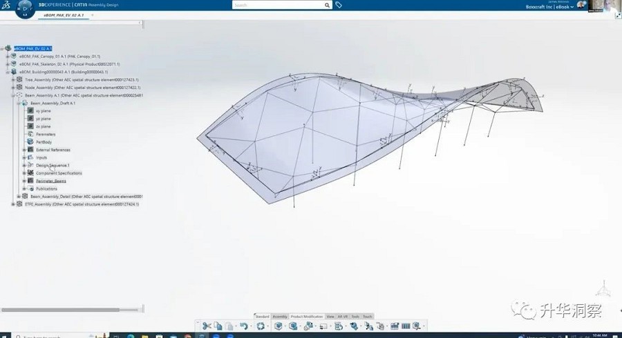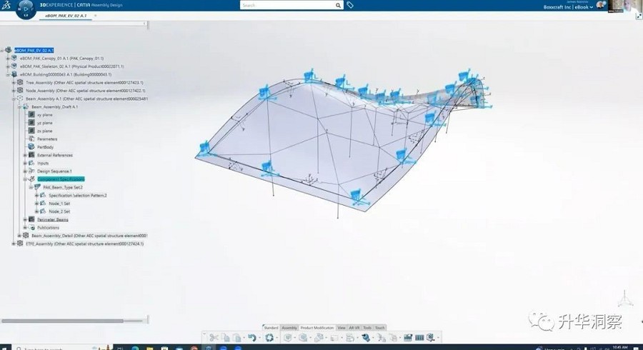 「所有這些材料都需要被分解成小元件,並且能夠由一個小團隊進行調整,以使整個過程更有效率。當我們談論碳足跡時,我們談論的是成本和影響,這也是一種思路。在專案中需要考慮所有的材料特性,包括木材、ETFE,鋼鐵也是如此。我們真的需要優化每一種元件及所有材料的使用位置,以簡化整個過程,而不僅僅是單個專案。」「當我們談論像 3DEXPERIENCE 這樣的平台時,我們談論的是真正能夠處理和分解整個過程的平台,從設計到製造再到物流和裝配操作。當我們查看設計標準時,我們會在整個過程中獲得回饋迴圈,因此我們可以根據元件對下游的影響來優化元件。」