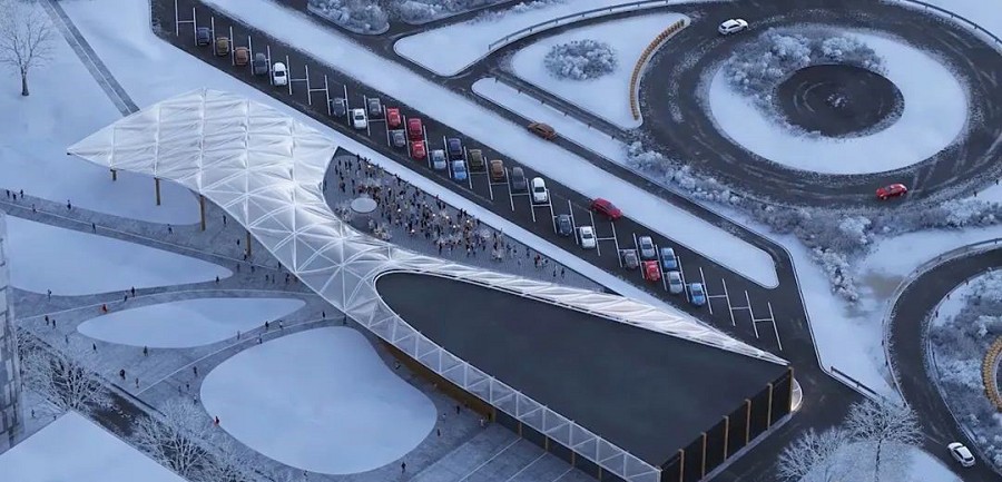 電動汽車體驗中心在其設計和使用方面為交通架構構想了一個靈活的未來。展館可兼作電動汽車充電站和交鑰匙活動場所,它的形式及組成部分可以根據其位置和需求而變化。展館起伏的屋頂由自清潔玻璃替代品組成,根據這些參數可為每個中心生成獨特的輪廓,並實現快速組裝。