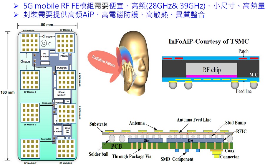 不過,面對更高速的應用,就無法以目前的技術來因應,因此在最近這幾年全球的晶片業者都相當積極的開發AiP的封裝技術,就是因為在系統端面對28 GHz、38 GHz的頻段時,是無法利用single pattern的方式達到,所以一定要用陣列方式,但又無法放入封裝裡,因此這是一個很大的挑戰。