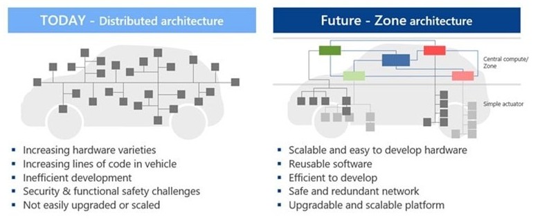 為了實現C.A.S.E.,必要的計算能力和網絡複雜性無法以經濟合理的方式通過傳統的E/E架構實現,因為分佈式E/E結構需要大量的電子 控制器(ECU),相應地增加了電纜線束的複雜性和重量,增加了整體功耗,並提高了成本。