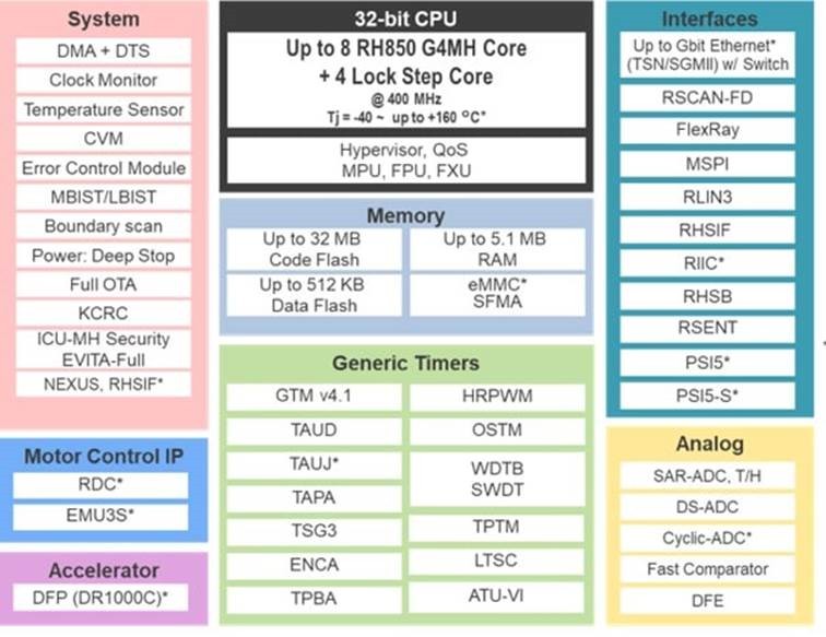 瑞薩RH850/U2x高性能微控制器產品線用於下一代區域/內建ECU,支持豐富的嵌入式HW關鍵功能,這些功能是區域應用所特有的,如Hypervisor HW支持、QoS(僅U2B支持)、功能安全和資訊安全,以實現無干擾。最重要的是,高性能的NoC(片上網絡)結構可以確保每個單獨內建的應用程序在外設和內存連接方面的實時行為。